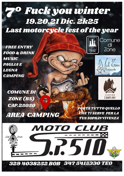 7° FUCK YOU WINTER 19.20.21 Dic. 2k25 Piramidi di zone, nato come l'ultimo evento motociclistico del anno e continua di stupirci ogni anno sempre con nuove presenze 🤭 ... location unica 🥶🥶🥶 La dove non batte il sole 😅🤣🤣🤣 🚩 ZONE (BS) 25050 -AREA CAMPING 🎪 Tensostruttura per offrire un minimo di calore 🤭 🏕️ Area dedicata ai partecipanti per tende e moto con paglia e legna. 🚾 Servizi igienici 🛏️ Per i più freddolosi c'è la possibilità di prenotare al calduccio presso i nostri partner che da anni hanno riguardo per i partecipanti del raduno💪🏻 ... per info contattare ⤵️ Camping Camplani https://share.google/UFxNMGRiD8Lmkbezm Albergo Piramidi Di Zatti https://share.google/XkfLKduZSgHOTDE6C