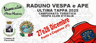PROGRAMMA DI SABATO 27 DICEMBRE: Ritrovo presso la sede del Vespa Club Dalle ore 14:00 – Accoglienza dei partecipanti presso la sede del Club in Via dei Granai, snc Ponte a Cappiano. Registrazione, consegna del kit di benvenuto e informazioni utili per la giornata. GIRO FACOLTATIVO A seguire, per chi lo desidera, partenza libera dalla sede del Club verso mete (a breve distanza) consigliate, per scoprire il territorio in sella alla propria Vespa. - dalle ore 17:00 ritrovo presso Le Tre Cupole per un gustoso merendino in compagnia. - dalle ore 17:30 alle ore 19:00: ANDREA PINASCO ci racconterà di persona la sua storia: da ragazzino innamorato della Vespa fece la sua prima trasformazione sostituendo il cilindro della sua Vespa con quello di una Vespa GS, di fatto iniziando la famosa doppia alimentazione. Da quella scoperta iniziò la storia delle trasformazioni che fecero impazzire i ragazzi degli anni '80-'90. Oggi Andrea ha cambiato la sua attività perché il genio non si ferma....si è dedicato alla agricoltura e alla creazione di giocattoli. Tutto quanto lo ritroviamo nei due libri: QUELLI DELLE VESPA TRUCCATE - OLIVE. CENA: Ore 20:00 – Cena esclusiva sulle storiche torri del Ponte Mediceo, tra sapori locali e atmosfera suggestiva. PROGRAMMA DI DOMENICA 28 DICEMBRE: Ritrovo presso il Ristorante La Casa Rossa (Via Provinciale Francesca, Ponte a Cappiano) Dalle ore 09:30 – Accoglienza dei partecipanti, registrazione, consegna del kit di benvenuto e colazione presso il Bar La Casa Rossa. Ore 10:45 – Partenza in Vespa per un breve giro turistico di circa 15 km, con arrivo nella suggestiva Contrada di Massarella. Ore 11:30 circa – Sosta gastronomica con distribuzione della tradizionale zuppa toscana accompagnata da vino locale. Ore 12:00 – Sempre a Massarella, premiazioni con consegna di trofei e targhe ai Club e ai partecipanti. Ore 12:30 – Saluti ai vespisti che concludono qui il loro raduno. Per tutti gli altri, rientro al punto di partenza (circa 7,5 km) per il pranzo. Ore 13:15 – Pranzo conviviale presso il Ristorante La Casa Rossa, con intrattenimenti vari. Ore 15:30 – Saluti finali e arrivederci al prossimo raduno! INFO E PRENOTAZIONI: - 347 6015259 (Enrico) - 340 5390979 (Giuliana) - 335 8221404 (Mauro) - 348 7639715 (Patrizia) ilpontemediceo@vespaclubditalia.it www.ilpontemediceo.it IMPORTANTE: Gadget garantiti per i primi 200 iscritti Pranzo garantito per un massimo di 120 partecipanti Per chi arriva il sabato, sono disponibili convenzioni con strutture ricettive locali (contattare l’organizzazione per dettagli) QUOTE DI ISCRIZIONE: Pacchetto base (gadget, attività e merendino del sabato, colazione e aperitivo della domenica): €20 (valido per conducente e passeggero) Cena del sabato sera: €20 a persona Pranzo della domenica: €25 a persona Quota ridotta DISPONIBILE SOLO AD ESAURIMENTO GADGET (attività e merendino del sabato, colazione e aperitivo della domenica): €15 PRE-ISCRIZIONE OBBLIGATORIA ENTRO IL 20 DICEMBRE 2025 Il pagamento va effettuato tramite bonifico bancario: IBAN: IT73R0842537870000030566673 Intestato a: Vespa Club Il Ponte Mediceo Causale: ISCRIZIONE RADUNO DICEMBRE 2025 Inviare la ricevuta del bonifico insieme al modulo di iscrizione entro il 20 dicembre. Non sarà possibile iscriversi nei giorni del raduno. https://www.ilpontemediceo.it/xva-raduno-vespa-e-apeultima-tappa-campionato-turistico-nazionale-2025.htm
