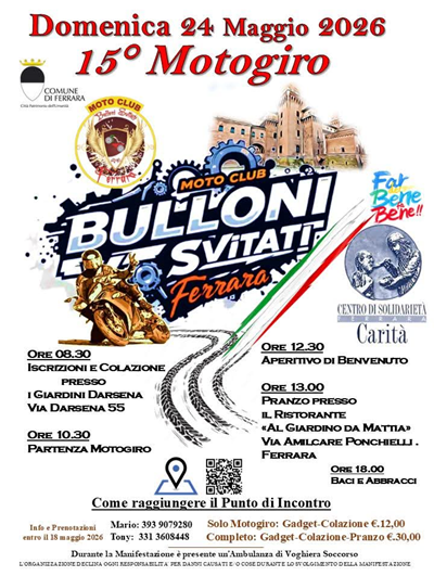 Il Motogiro Patrocinato dal Comune di Ferrara è organizzato a scopo Benefico, rivolto all'Associazione "Centro di Solidarietà e Carità di Ferrara", tutto il ricavato verrà donato. Dalle ore 08:30 il punto di incontro è presso i Giardini del Darsena. (Per raggiungerci, inquadrate con il vostro smartphone in basso alla locandina il codice QR) Ogni partecipante effettuerà allo Stand del Moto Club la sua iscrizione e la consumazione della colazione presso il Bar "I Giardini del Darsena". Alle ore 10:30 partirà il Motogiro scortati da pattuglia motociclistica e una Ambulanza di Voghiera Soccorso, percorrendo circa 45 chilometri di Itinerario nel territorio del Comune di Ferrara e terminerà alle ore 12:00 presso il Ristorante con Aperitivo di Benvenuto e subito dopo il Pranzo "Al Giardino da Mattia" via Amilcare Ponchielli 7, Ferrara. Durante il Pranzo e anche dopo si esibirà la Bravissima Alberta con la sua Musica e alla fine la somma raccolta verrà consegnata all'Associazione "Centro di Solidarietà e Carità di Ferrara". Amici, Moto Club e simpatizzanti del nostro gruppo, come sempre vi aspettiamo in tanti per una giusta causa.