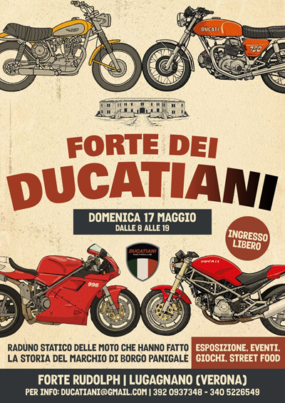 🏍️ IL FORTE DEI DUCATIANI Ti aspettiamo al raduno statico con esposizione delle moto che hanno fatto la storia del marchio di Borgo Panigale! 📅 Domenica 17 Maggio 2026 📍 Forte Rudolph, via Lugagnano n.87, Verona (VR) 🔥 INGRESSO LIBERO E GRATUITO 🍝 Durante la giornata ci saranno giochi, eventi e soprattutto Street Food 📲 Se vuoi esporre la tua moto contattaci! Ovviamente tutto gratuito!!